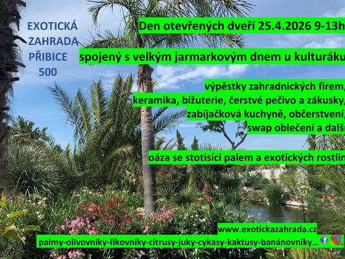 Zahrada je plná velkých palem desítek druhů včetně mrazuodolných, plodících olivovníků, citrusů, kiwi a fíkovníků, obřích stromových juk stromových kapradin, kaktusů, cykasů, banánovníků, pokojovek a spousty exotických rostlin. Exotické rostliny od malých sazenic po šestimetrové palmy si můžete nejen v tento den zakoupit za výhodné ceny. Olivovníky na kmínku i silné staleté stromy, palmy od semenáčků, až po monumentální velikosti, kvetoucí strelície, exotické ovocné rostliny. Nahlédnout do zahrady můžete také prostřednictvím fotogalerie na www.exotickazahrada.cz. Provozní doba zahrady všední dny 10-17, sobota 9-13.