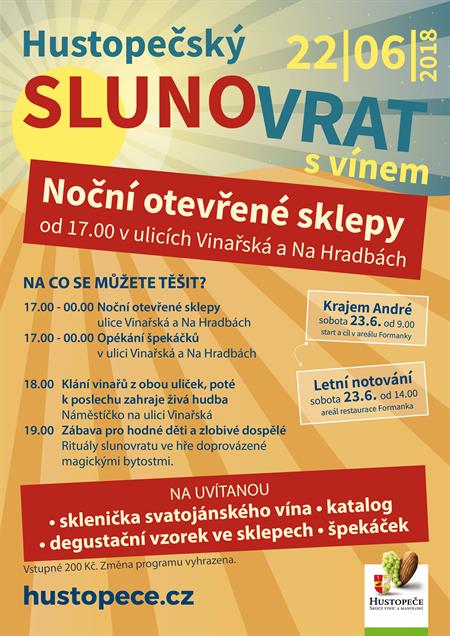 Příchod letního slunovratu je vždy očekáván s nedočkavostí. Síla slunce vrcholí a začíná období léta. Jedna z nejkratších nocí si po staletí zachovává nádech magie a kouzel a patří k ní ohně, které podle tradic dodávají slunci sílu. V Hustopečích se tento svátek slaví od loňského roku s vínem a tvoří pomyslnou bránu k letní sezóně otevřených sklepů.