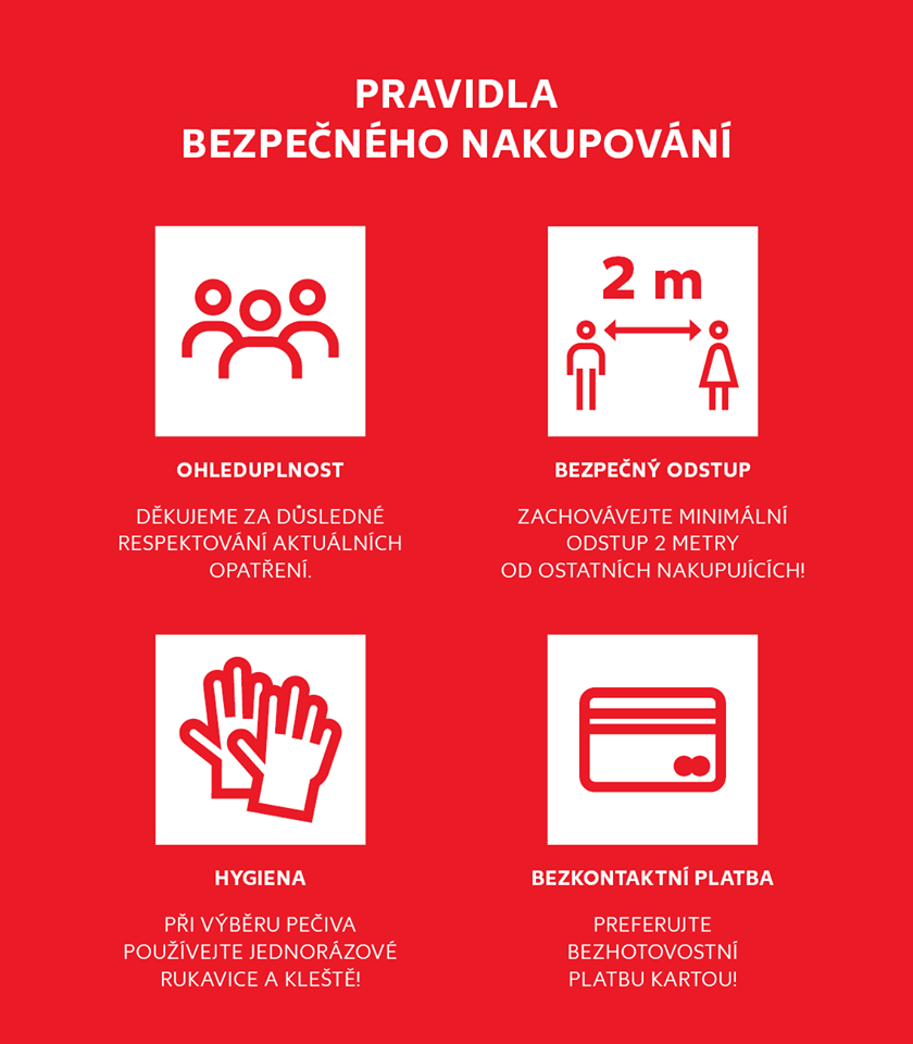 Například supermarkety jsou však i nadále otevřené podle běžné provozní doby. Právě obchody s potravinami zůstávají jedním z mála míst, kde se může potkávat větší množství lidí, a proto by se zde měla zodpovědně dodržovat hygienická pravidla, a to ze strany zákazníků i zaměstnanců.