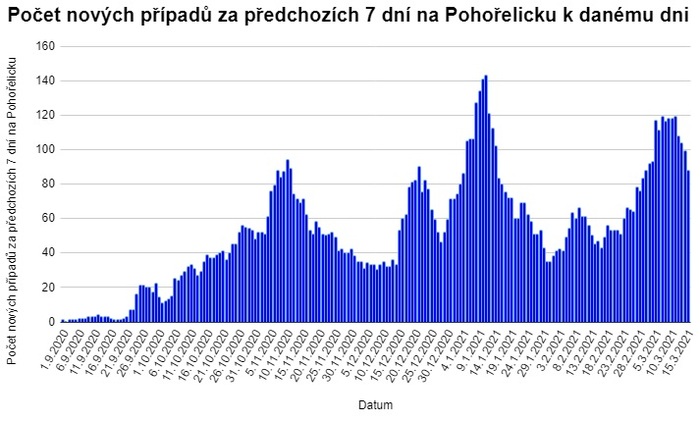 Na Pohořelicku bylo k 15. březnu 2021 zaznamenáno 88 nových případů onemocnění Covid-19 za posledních 7 dní. To je nejméně od 3. března 2021. Vyplývá to z otevřených datových sad Ministerstva zdravotnictví České republiky.