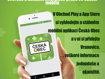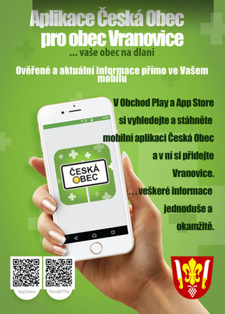 Stačí si ji zdarma nainstalovat do svých telefonů. Aplikaci ČESKÁ OBEC vyhledáte na Google Play pro telefony s OS Android nebo Apple store pro telefony Apple. (Android nebo iPhone) spustit a vyhledat Vranovice. Potom už vám budou automaticky chodit upozornění a nové informace přímo do oznamovací lišty vašeho telefonu.