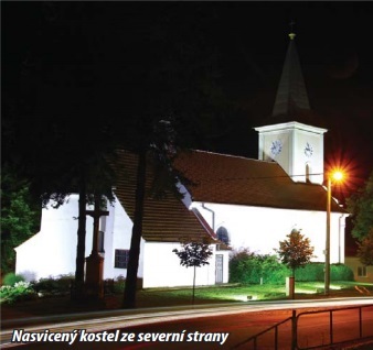 V červnu letošního roku nechalo vedení obce zpracovat návrh na osvětlení našeho kostela. Projekt s propočtem rozložení, typu a intenzity a správné natočení svítidel připravila firma Štoll z Ladné. Je to firma, která má za sebou nasvětlení spousty kostelů, hradů a dalších významných staveb.