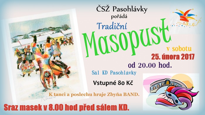 Český svaz žen Pasohlávky srdečně zve na tradiční masopust. Sraz masek do průvodu po vesnici je v 8 hod. před kulturním domem. Večerní zábava se bude konat od 20 hod. a sraz masek je o půl 9 v sále. K tanci i poslechu hraje Zbyňa Band. Vstupné je 80 Kč.