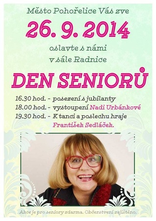 V pátek 26. září se bude v Pohořelicích slavit Den seniorů. V sále Radnice od 18:00 vystoupí známá česká zpěvačka a pětinásobná zlatá slavice z let sedmdesátých Naďa Urbánková. Jistě zazní její největší hity jako Závidím, Drahý můj či Blonďák s červenou bugatkou. Od 19:30 bude k poslechu i tanci hrát František Sedláček. Občerstvení bude zajištěno. Vstup je pro seniory zdarma.