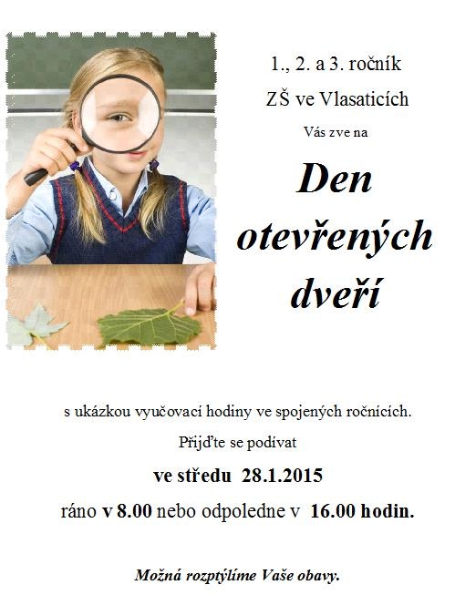 Den otevřených dveří se koná ve středu 28. 1. 2015 ráno v 8:00 nebo odpoledne v 16:00. V obou časech vás čekají ukázkové hodiny, po odpolední hodině bude pro zájemce z řad rodičů následovat neformální posezení s vedením školy a učitelkami 1. stupně.
