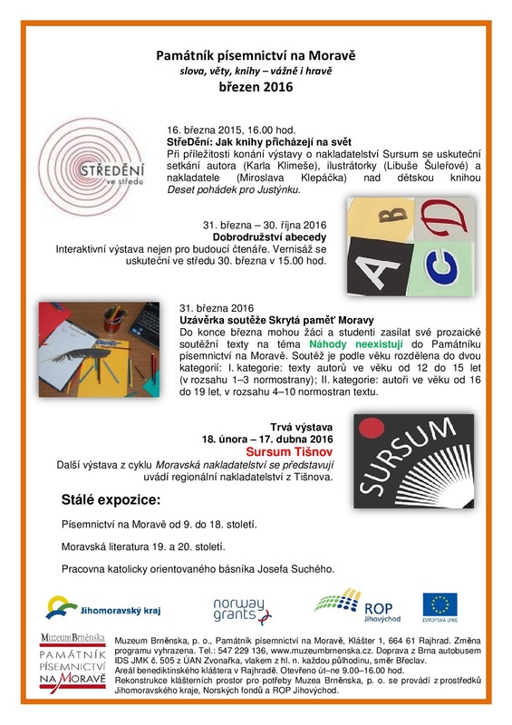 V březnu pořádá Památník písemnictví na Moravě několik zajímavých výstav s podnázvem Slova, věty, knihy - vážně i hravě. Šestnáctého března proběhne StřeDění: Jak knihy přicházejí na svět, kde se setkájí tvůrci knihy Deset pohádek pro Justýnku. Od 31. 3 do 30. 10. se koná interaktivní výstava pro čtenáře Dobrodružství abecedy. Do konce března mohou dále zájemci zasílat své soutěžní texty do soutěže Skrytá paměť Moravy. Téma zní: Náhody neexistují. Do 17. dubna dále probíhá trvalá výstava Sursum Tišnov z cyklu Moravská nakladatelství se představují.